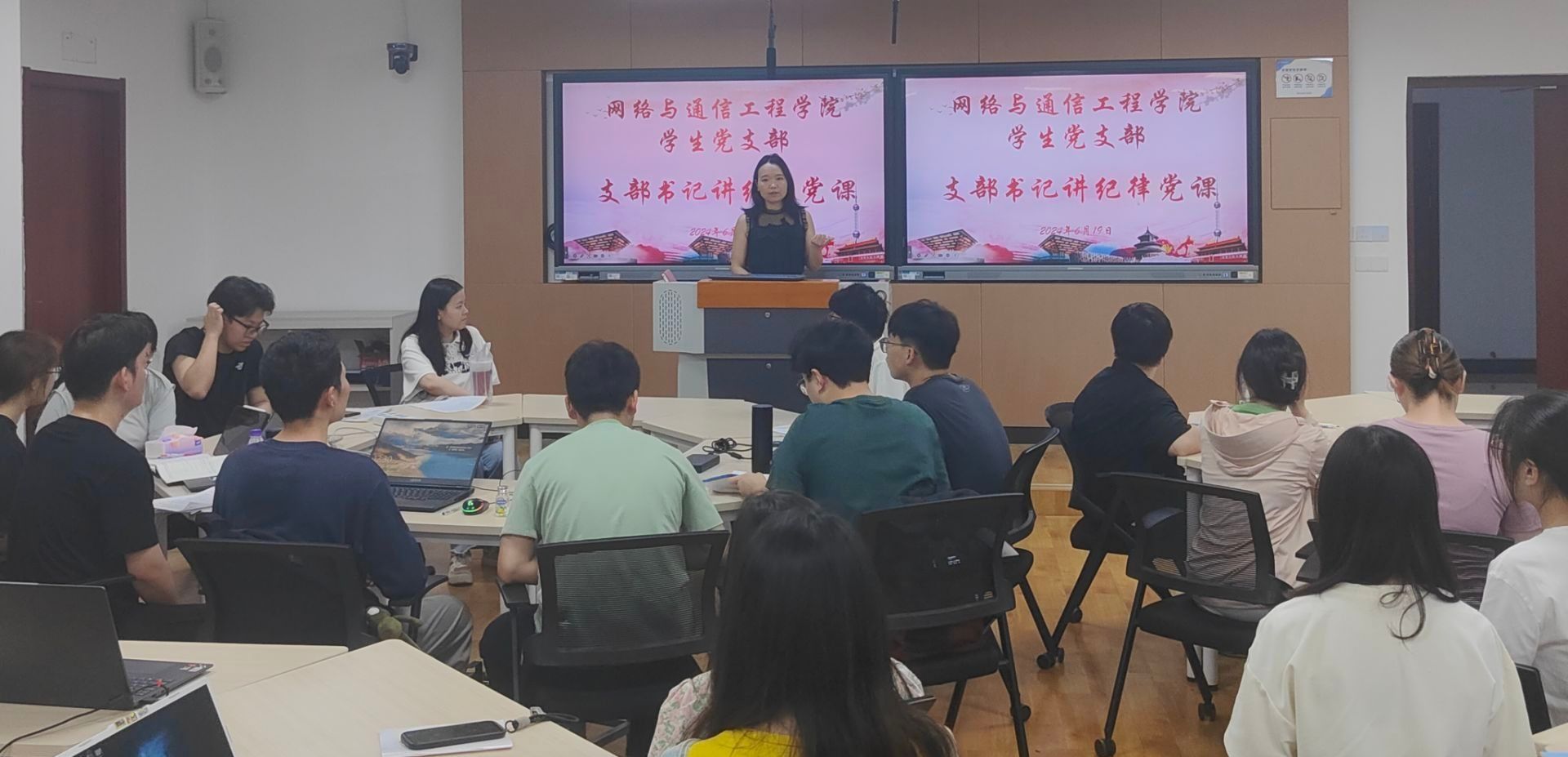 各支部首先学习了习近平总书记今年3月份以来关于党纪学习教育的重要论述,各支部书记领学了近期出版的《习近平关于全面加强党的纪律建设论述摘编》。通信系教师党支部书记吴杰和光电系教师党支部书记叶全意围绕《中国共产党纪律处分条例》修订内容、新增条款、学习贯彻措施等方面进行深入解读。机关实验室教工党支部书记朱湉湉为以“学纪、知纪、明纪、守纪”为主题,从学纪筑牢信仰之基、知纪坚守红色底线、明纪增强规矩意识、守纪清正廉洁展现担当四个方面引导党员在党纪学习教育中履职尽责做好表率。学生党支部书记朱艳红围绕“六大纪律”展开,党课结合学生党员容易出现的风险问题和实际案例教育党员要切实把“六项纪律”落实到日常学习、工作和生活中,抵制不良诱惑,做到清清白白做人,踏踏实实做事。最后,全体师生党员结合个人实际情况,对照“六项纪律”查摆问题风险,并依次做检视整改发言。