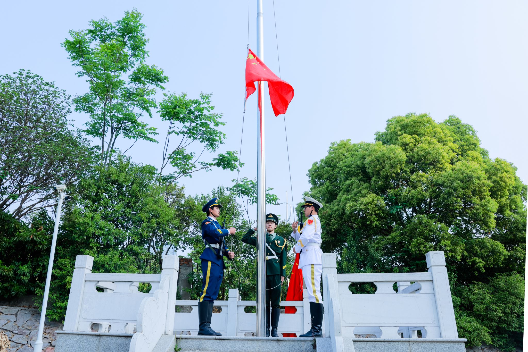 迎着初升的朝阳,校国旗护卫队迈着铿锵有力的步伐,以昂扬向上的风姿护卫着鲜艳的五星红旗来到升旗台前;随着雄壮的《义勇军进行曲》奏响,鲜艳的五星红旗在全体师生庄严注目中冉冉升起。
