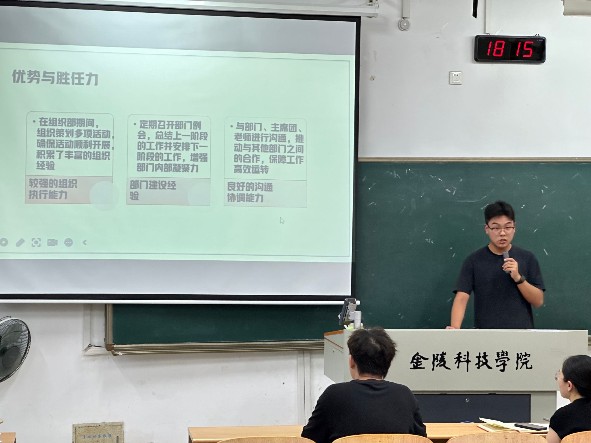 会上,学联主席团严睿同学简要汇报了本届学联的工作情况,鼓励学联同学发扬团结协作精神,为服务同学不断开拓创新。随后各部门候选人依次上台进行竞选,阐述工作思路与未来规划,大家表示将秉承优良传统,推动学联工作再上新台阶,为校园文化建设贡献力量。外联部部长陈若凝介绍了去年暑期社会实践的主要内容和今年相关要求,激励各班同学踊跃参加暑期社会实践。