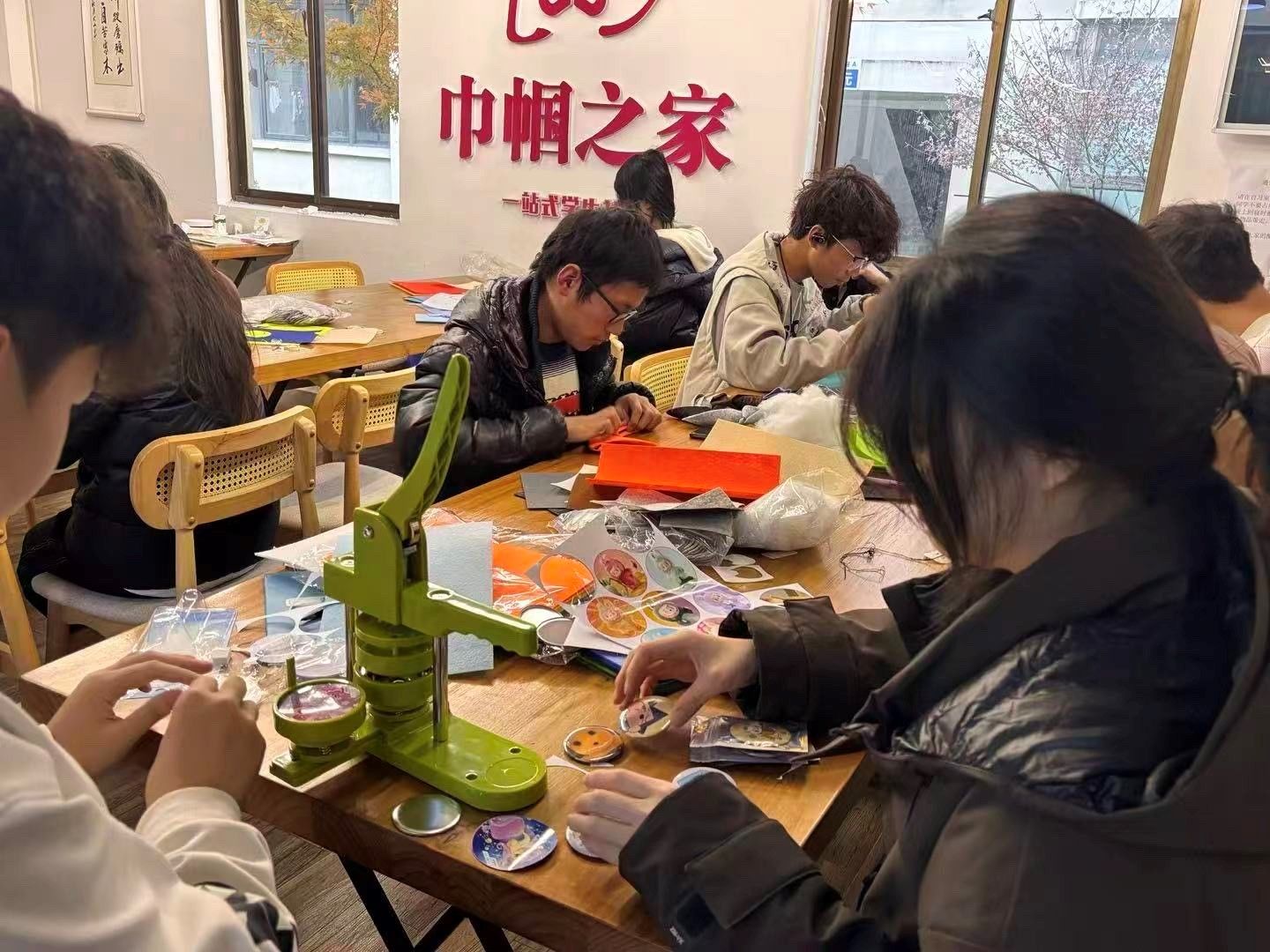 活动聚焦 “不织布创意摆件”与“个性徽章(吧唧)制作”两大主题,现场准备了缤纷的不织布材料、安全工具及徽章制作素材。同学们或结伴协作,或独自沉浸创作,在剪裁、拼接、粘贴中将平凡材料化为灵动作品——憨态可掬的布艺小动物、精致的花卉挂件渐次诞生;徽章制作区里,大家精选图案、亲手压制,打造出独一无二的纪念章。创作过程中,欢声笑语与创意分享交织,原本陌生的同学在协作中拉近距离。当一件件充满巧思的手工作品完成时,成就感的笑容洋溢在每个人脸上。