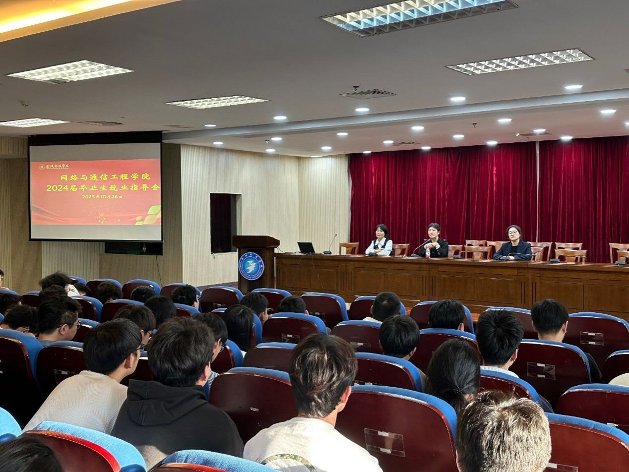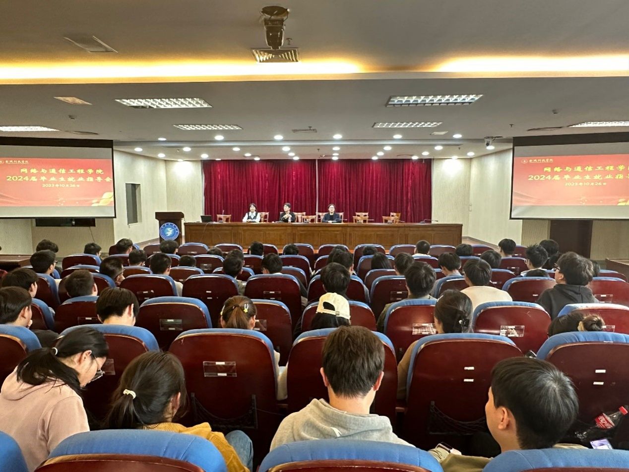 在图书馆第二报告厅召开2024届毕业生就业指导会。本次会议特邀请到了智一生、查浩毅、陈伟建、余冠廷四名优秀校友介绍工作经验,院党委书记陈健,副书记董宇,全体2024届毕业生参会,会议由学工办主任郑灵敏老师主持。